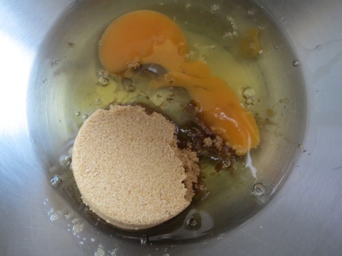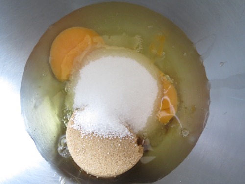 In a large bowl, using an electric mixer, beat eggs, sugars until well combined. Add banana and whisk until well combined.