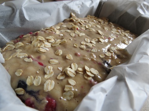 Fold in berries and pour into your prepared loaf pan. Sprinkle rolled oats over the top and bake for 40-60 mins (until a toothpick comes out virtually clean when inserted into the centre) Allow to cool in the loaf pan for 10 mins then slice and enjoy 🙂