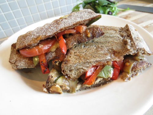 Actually, I can’t guarantee there will be any of this delicious toasty, meaty, cheesy vegetarian panini left for you by the time you get here so I suggest you go out to pick yourself up some tasty bread and make this sandwich. Like today!