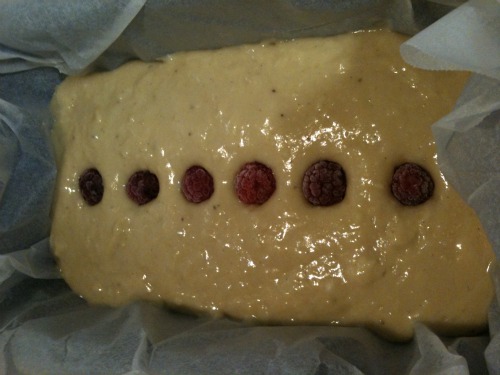 Place raspberries evenly down the centre of the batter and gently press them into mixture.