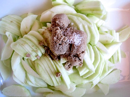 Throw your sliced apples into a baking dish (I used 13×7 Inch) and add brown sugar, salt and cardamom and stir to combine.