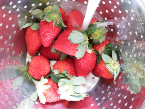 Take your deliciously plump and seriously juicy strawberries and place them in a colander and give them a good wash under some cold running water.