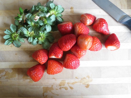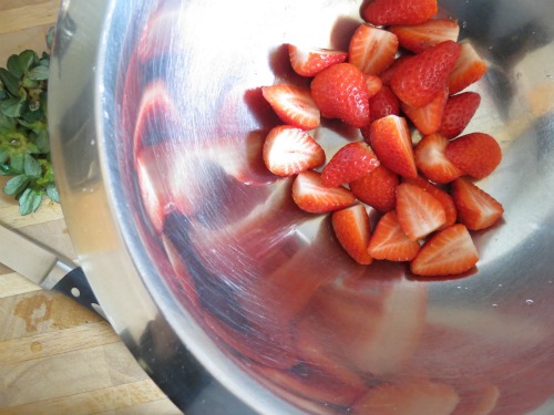 Chop the tops off . . . Then cut the strawberries in half and place them in a medium size bowl.