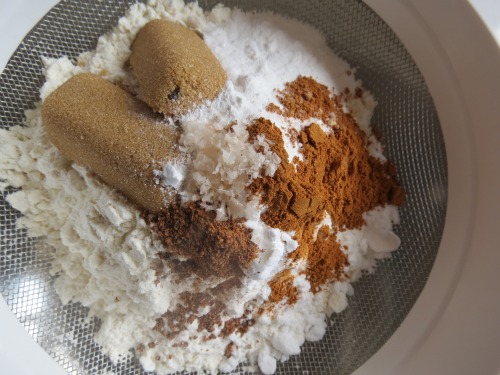 In a medium bowl sift flour, baking powder, baking soda, brown sugar, cinnamon, nutmeg and salt.