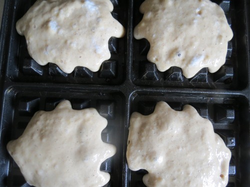 Pour spoonfuls of batter into the waffle iron (I use 1/4 cup measure) and cook according to manufacturers direction.