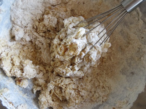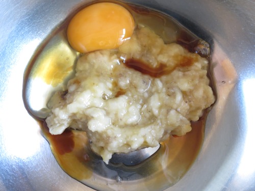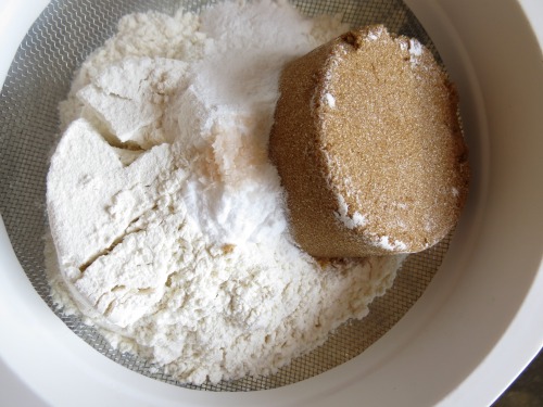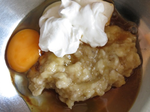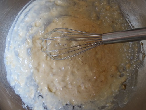 Sift flour, sugar, baking powder, baking soda and salt over banana batter and stir until well combined.