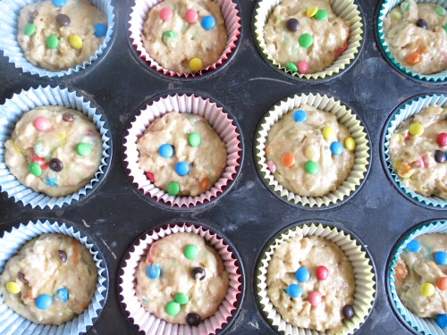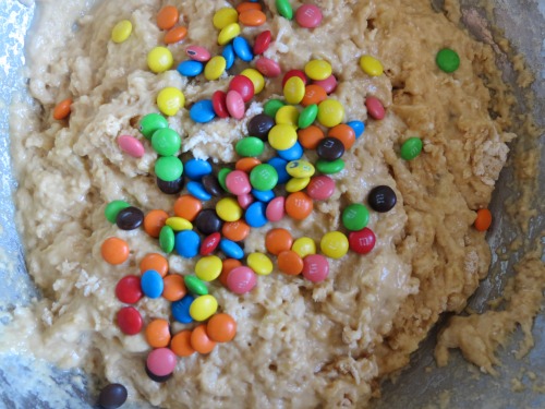 Add mini m&ms and carefully stir to combine but do not over mix.