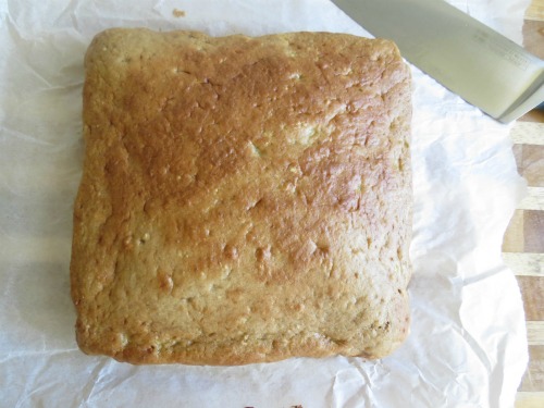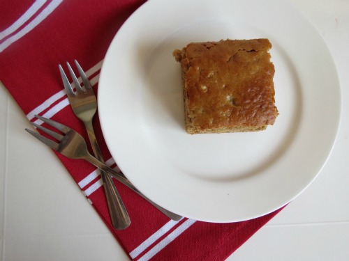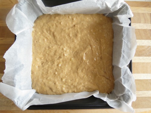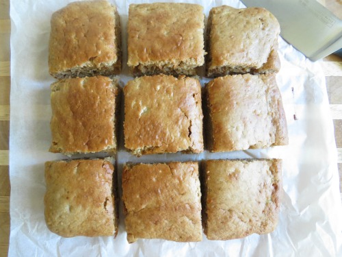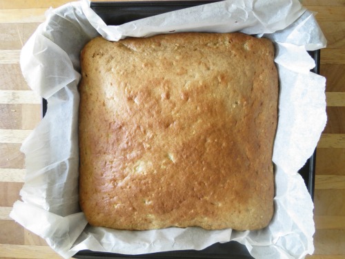 Pour into prepared baking pan (I used an 8×8) and bake for approx 20-25 mins. Until golden around the edges and top springs back when lightly pressed. A toothpick should have just a few moist crumbs attached when inserted into the centre.
