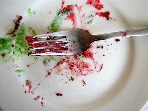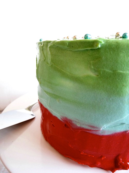 I chose to frost it with our current fave frosting – a whipped vanilla frosting I discovered thanks to the gorgeous Katie over at Dashing Dish which I tinted in little mr’s favourite colours – red, blue and green. Do what you feel people, make it, own it, love it 🙂