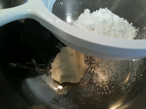 Place your cream cheese in a medium size bowl, sift in the icing sugar
