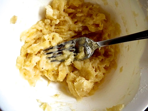 Peel bananas then mash in a small bowl and set them aside.