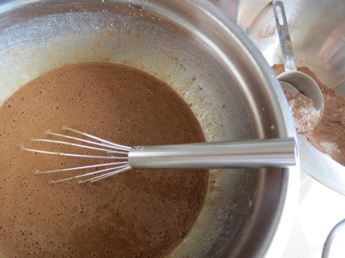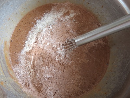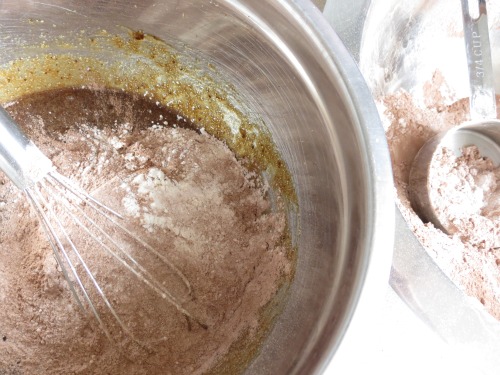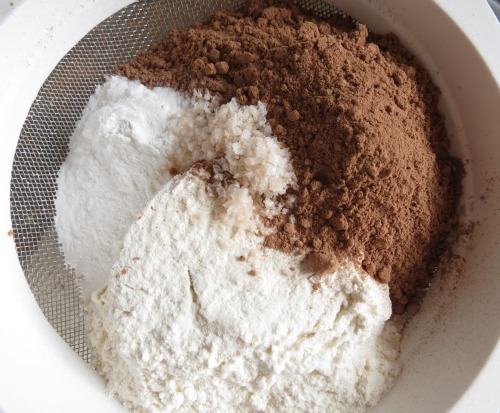 In a medium bowl sift flours, cocoa powder, baking powder, baking soda and salt.