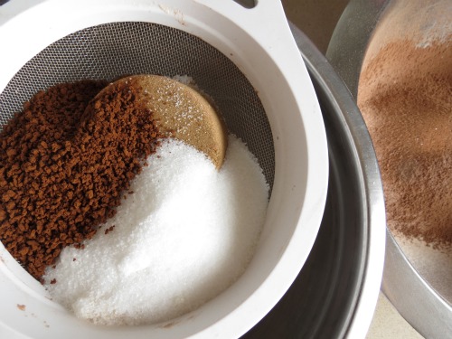 In another medium bowl, sift sugars and instant espresso.