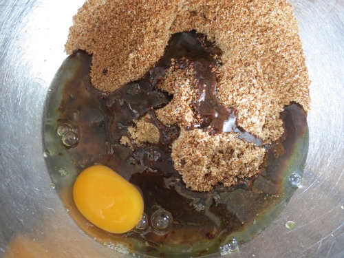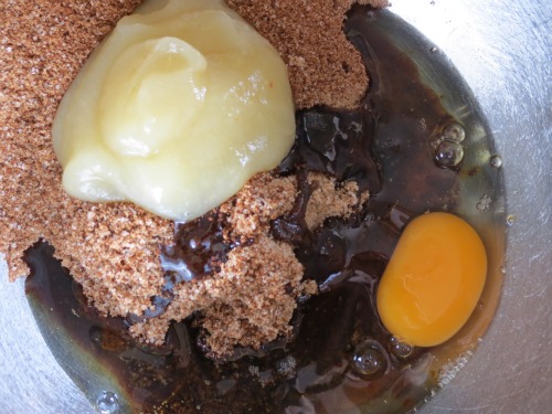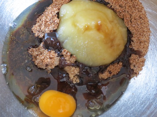 Add egg and egg whites, then apple sauce and vanilla and whisk until well combined.