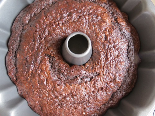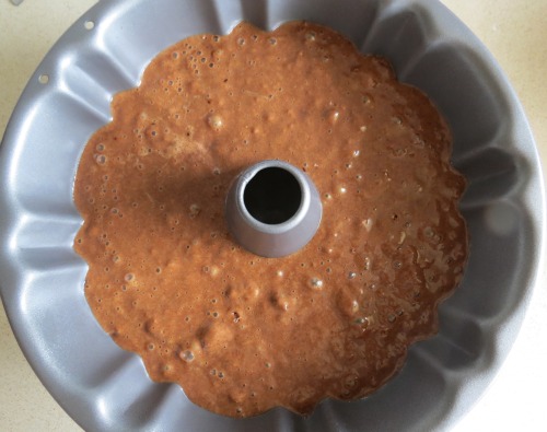 Pour into your brand new bundt pan and bake for 40 mins (until toothpick comes out with just a few moist crumbs attached and cake springs back when gently pressed).