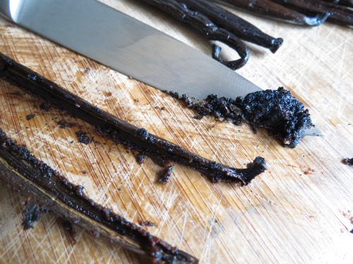 Using a sharp knife, split the vanilla bean and carefully scrape out the seeds.