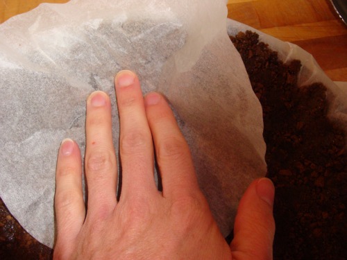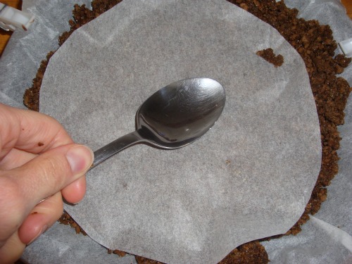 Then finish off pressing in the corners and edges with my fingers. I have tried just using my fingers or a spoon with no baking paper but found myself very frustrated as the mix would always stick to my hands or the spoon and not the pie plate!