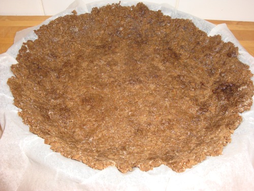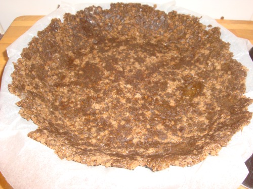 With a small section of baking paper carefully press and smooth the crust to evenly cover the pie plate. I find it easiest to start this with the back of a spoon