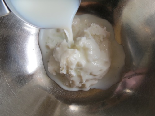 Now add 1/2 of the milk/ricotta mix and whisk until just combined.