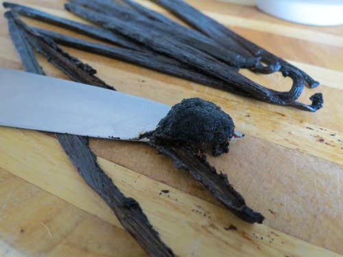 Using a sharp knife slice one vanilla bean in half lengthwise, then scrape out the seeds.