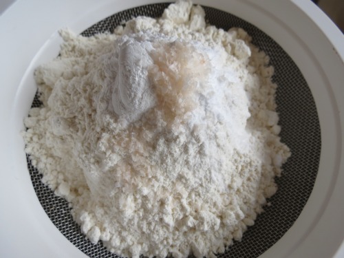 In a medium bowl sift flour, baking soda, baking powder and salt. Mix for about 30 seconds until combined.