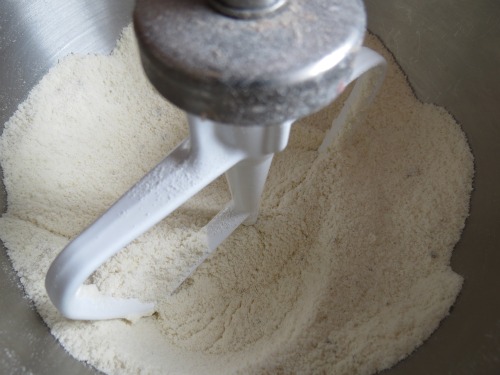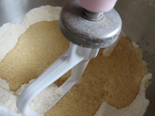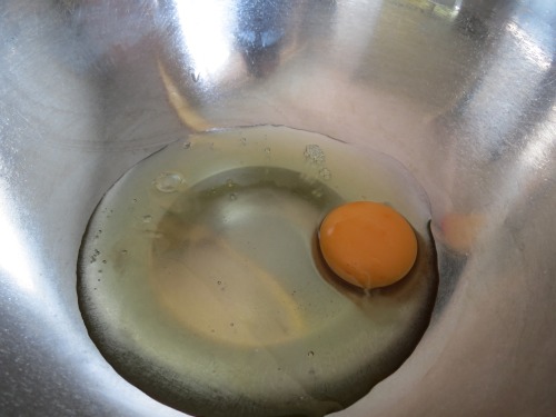 Add the egg mix to the flour mix, and beat at medium speed until just combined.