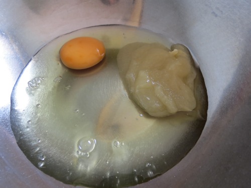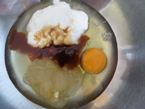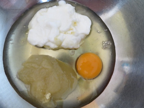 Next, in a small bowl add egg and egg whites, apple sauce, yoghurt and vanilla and whisk until smooth.