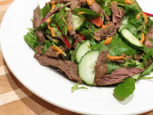 This marinade seriously enhances the flavour of the steak. It really brings out its . . . meatiness (Although just quietly, its so good that I plan to try it on both chicken and fish in the not to distant future). This aint no baby salad, this salad is packed with flavour and would win the heart of even the manliest of salad haters.