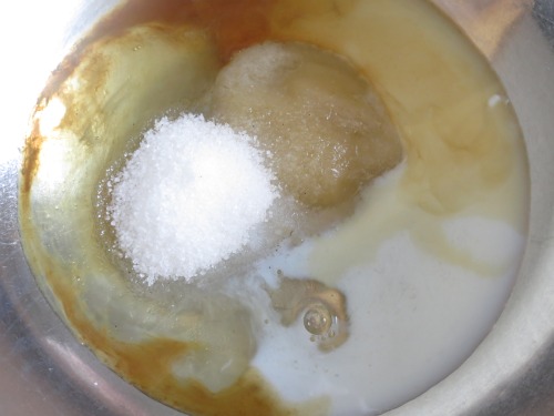 Add milk, egg white and vanilla and then sugar and stir until well combined.